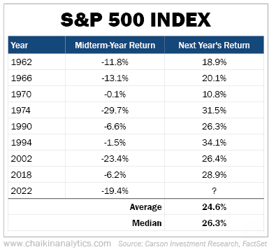 El 2022 ha sido la novena vez desde 1950 en la que siendo año de elecciones de mitad de mandato la bolsa terminó en negativo y observen en la siguiente tabla qué ocurrió en el resto de las 8 veces: